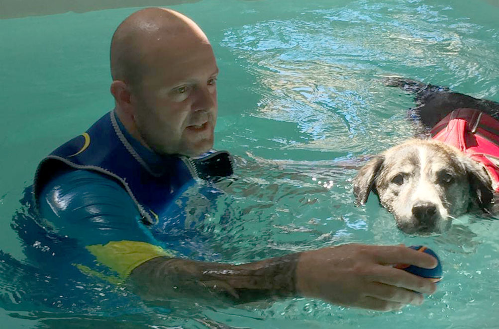 Antony in the hydrotherapy pool with Ollie.